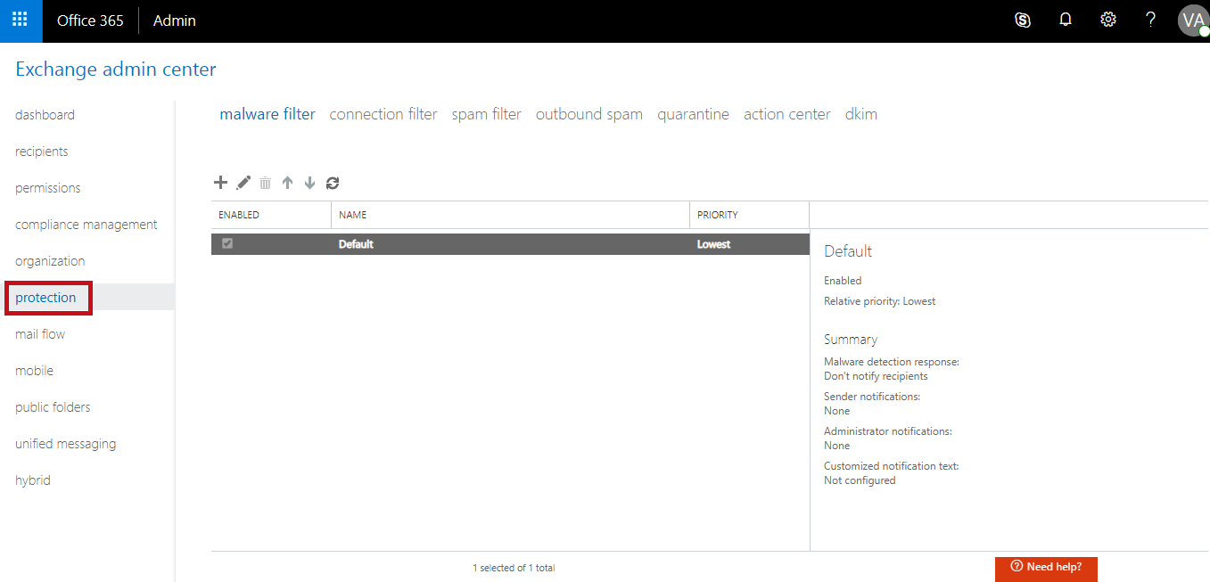 - You will enter the Exchange admin center page. Select the Protection menu.