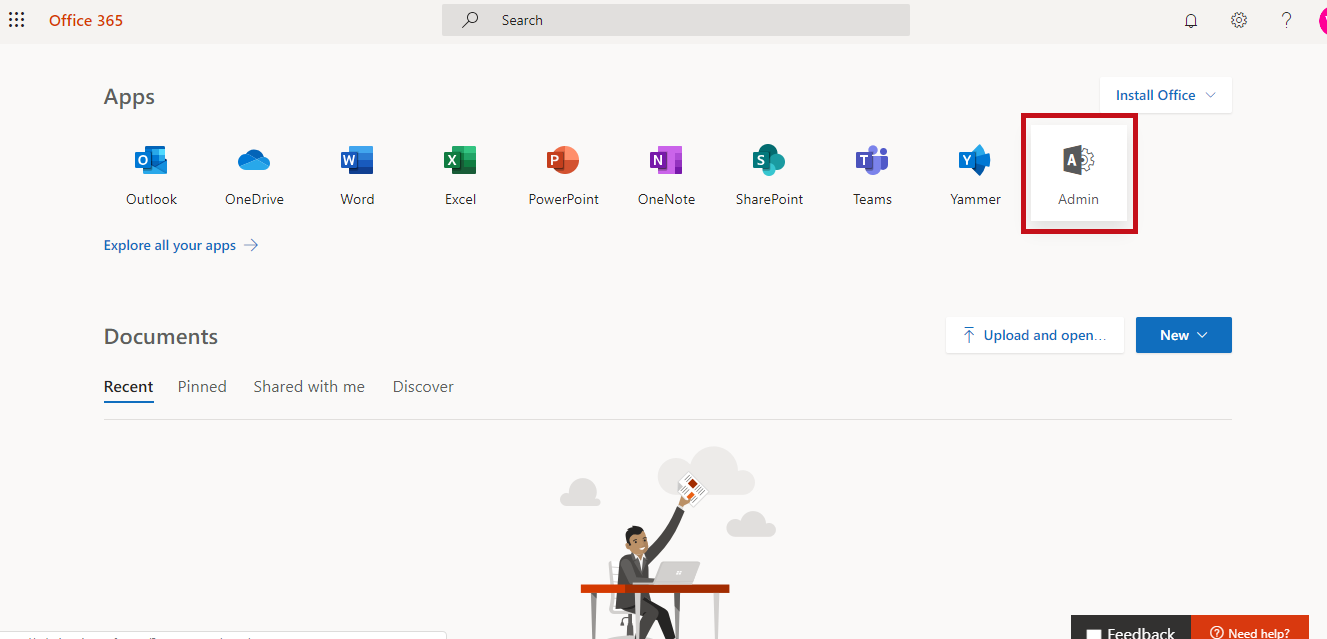- Make sure you are logged in to Office 365 as an admin to add the whitelist. Then click the Admin menu.