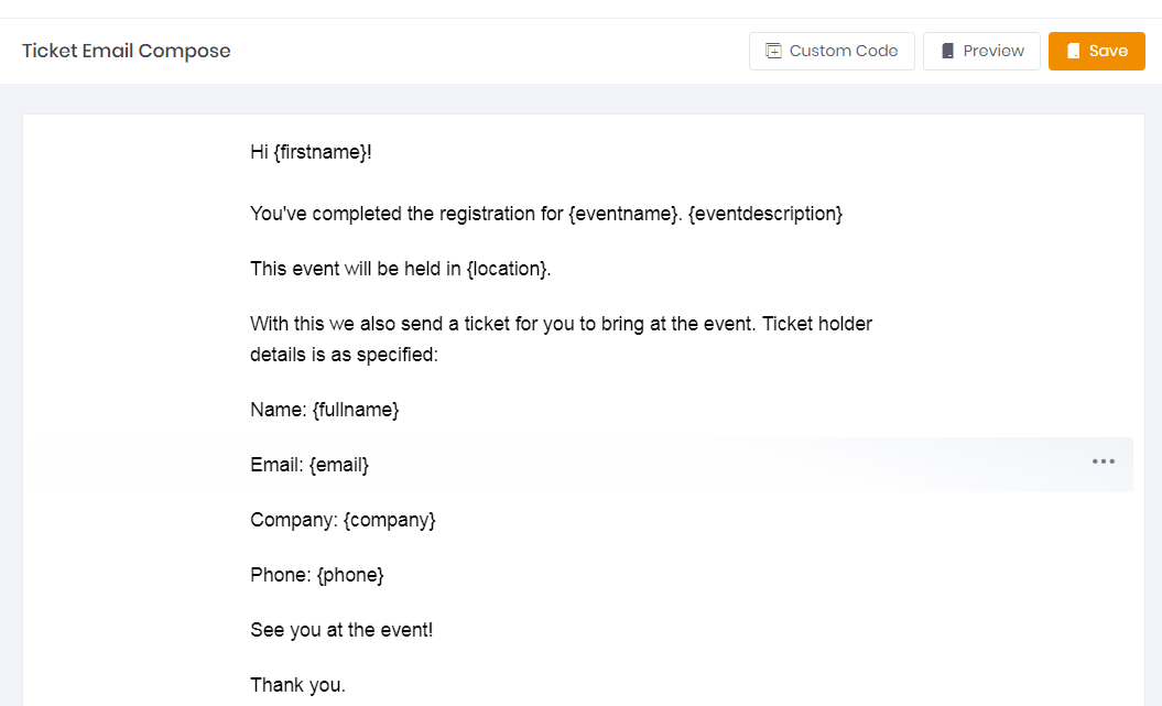 - Custom Code: Contains tag fields that you can attach according to the participant's personal data, such as first name, event name, email address and others.